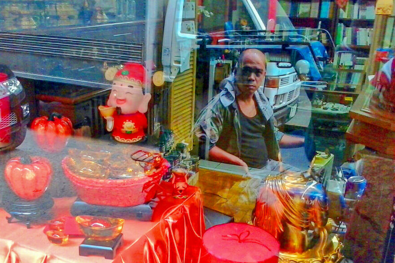 A tricycle driver is reflected on a shop's windows as he looks at wares for sale in Binondo, Manila two weeks before the world's oldest Chinatown celebrates the Lunar New Year. Binondo differs from other Chinatowns not only because of its age, but of the unique brand of syncretism that Filipino culture allows. In this photo, a representative of a unique Pinoy mode of transportation is melded with Chinese elements, a visualization of Binondo as a suitable crucible of cultures. 2014