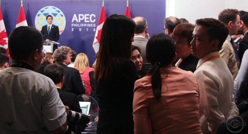 Reporters huddle behind the scenes of Canadian Prime Minister Justin Trudeau's press briefing at the APEC Summit in Manila. November 2015. PTV