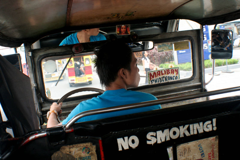 A jeepney driver puffs away despite having a 'no smoking' warning behind his seat in Pasay. Although the LTFRB has enforced a smoke-free policy on public utility vehicles, it has been loosely implemented. June 2012. GMA News