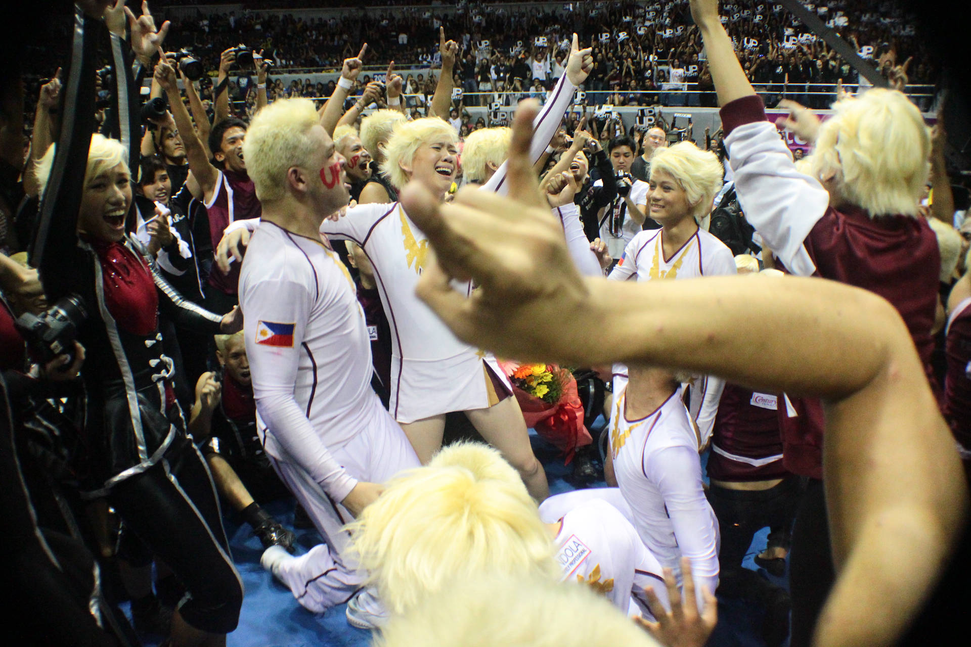 The UP Pep Squad erupts into cheers as they grab the top prize at the first group stunts category of the UAAP Cheerdance Competition in September 2011. GMA News