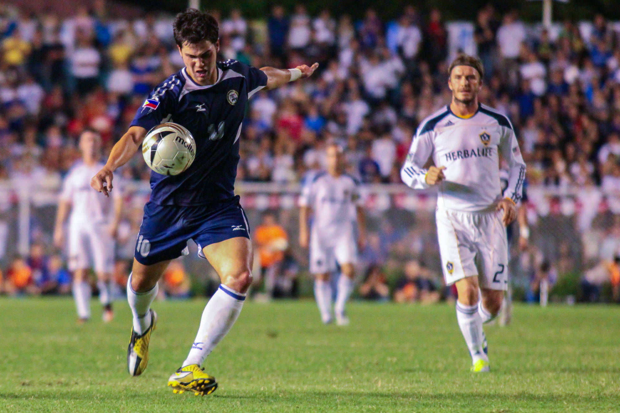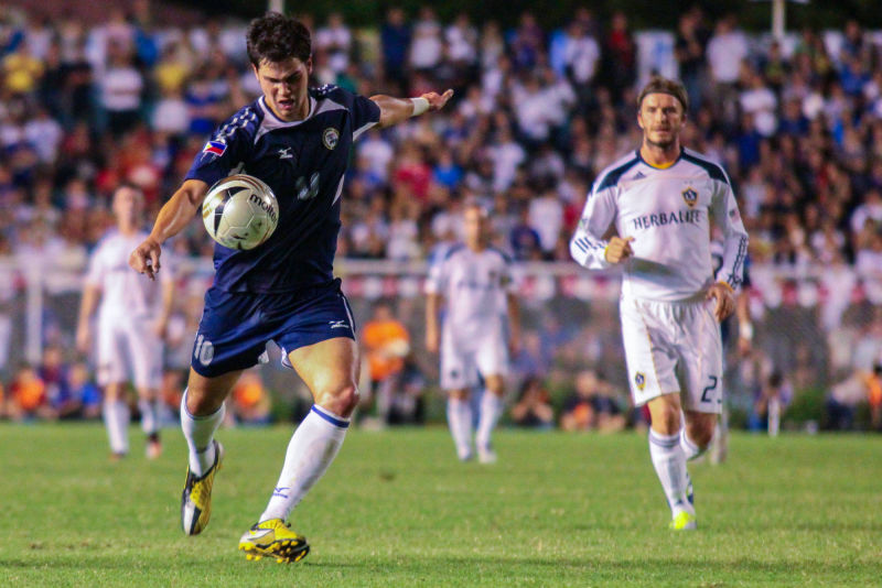 Azkals star Phil Younghusband strikes as football legend David Beckham of Los Angeles Galaxy looks on during their friendly game at the Rizal Memorial Stadium on December 3, 2011. Younghusband later on scored the Philippine national team's lone goal in a 1-6 defeat against the 2011 Major League Soccer Champions. GMA News