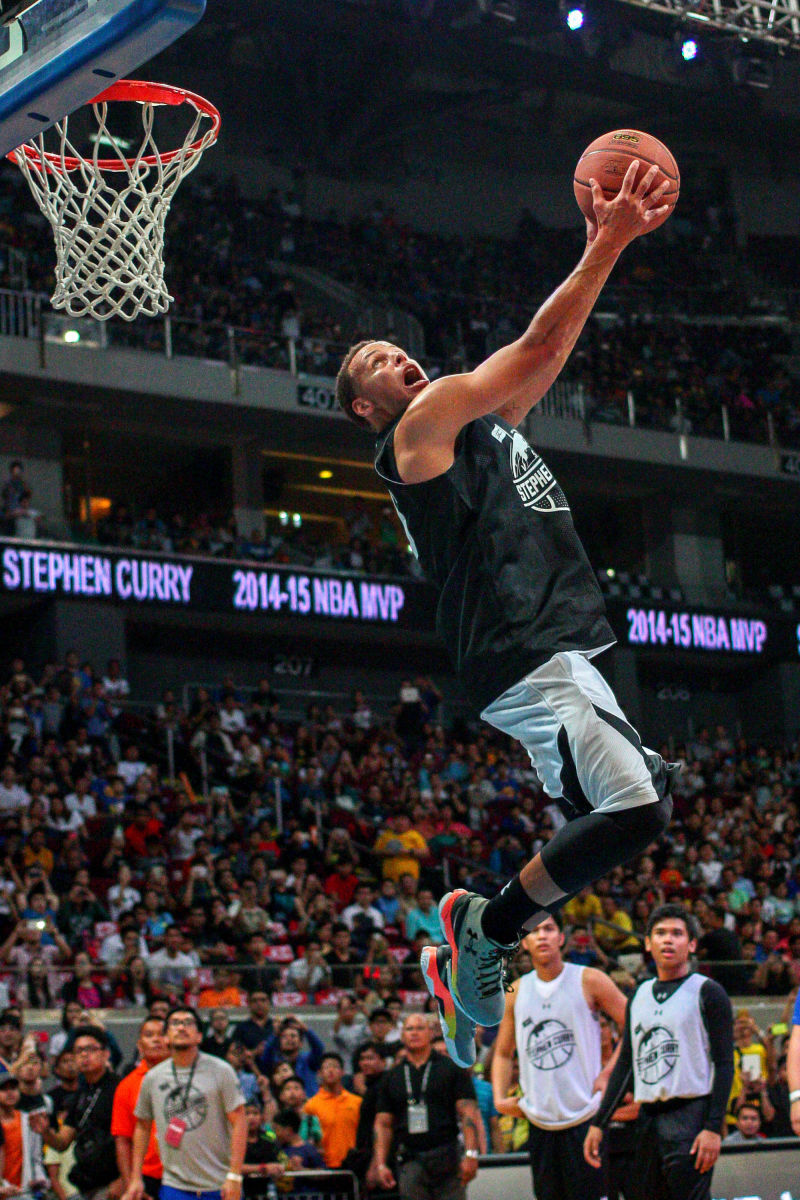 Steph Curry of the Golden State Warriors stretches a two-handed reverse dunk for his fans at the Mall of Asia Arena on September 4, 2015. The 2014-2015 NBA MVP had a good time playing with young ballers and interacting with fans as he topbilled the UnderArmour Roadshow Campaign. fullcourtfresh.com