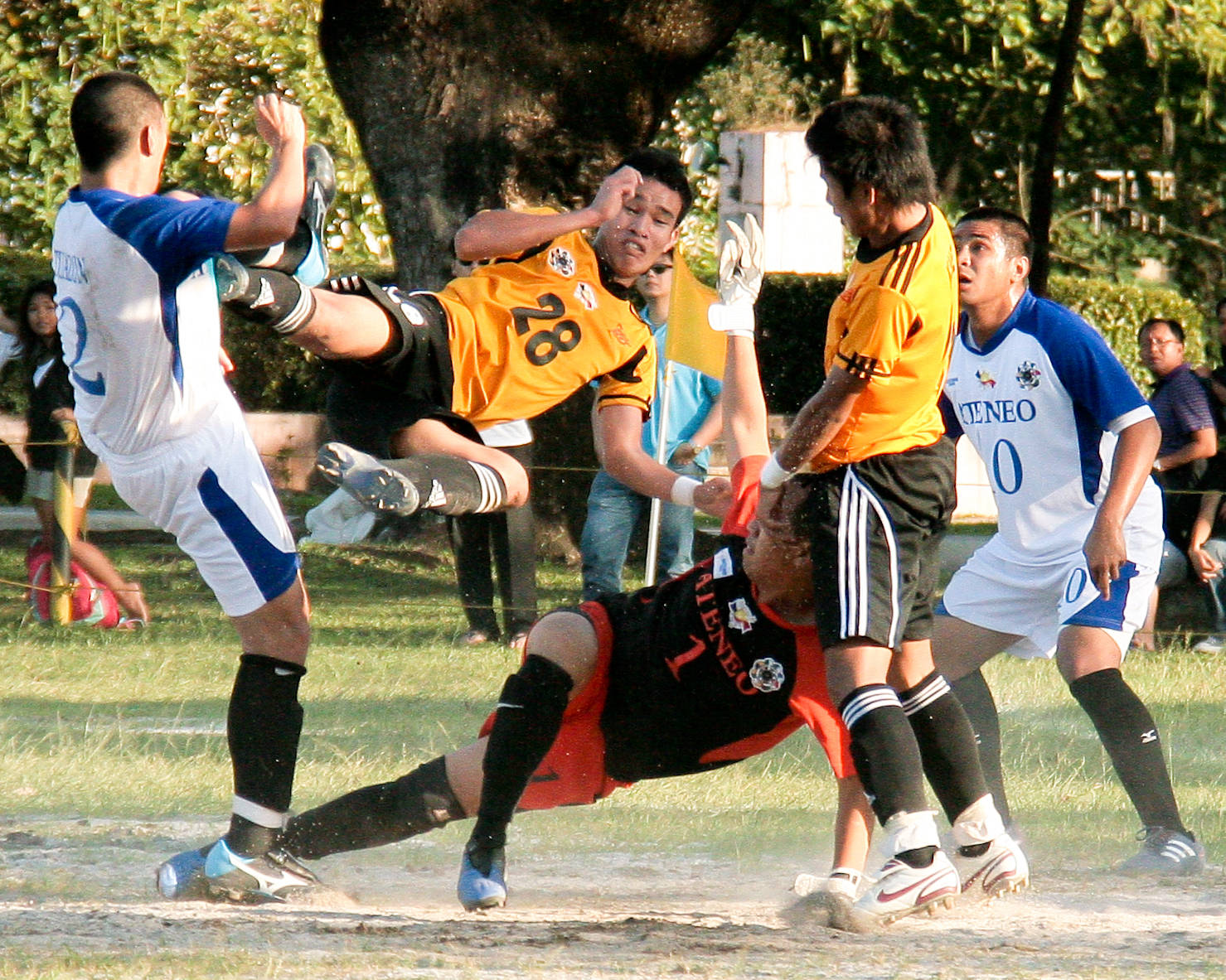 Shaolin Soccer: Jumping Sidekick. UST’s Ronald Batisla-Ong strikes Ateneo’s Miguel Tuazon in a mad scramble near the Blue squad’s goal. January 2011. fullcourtfresh.com