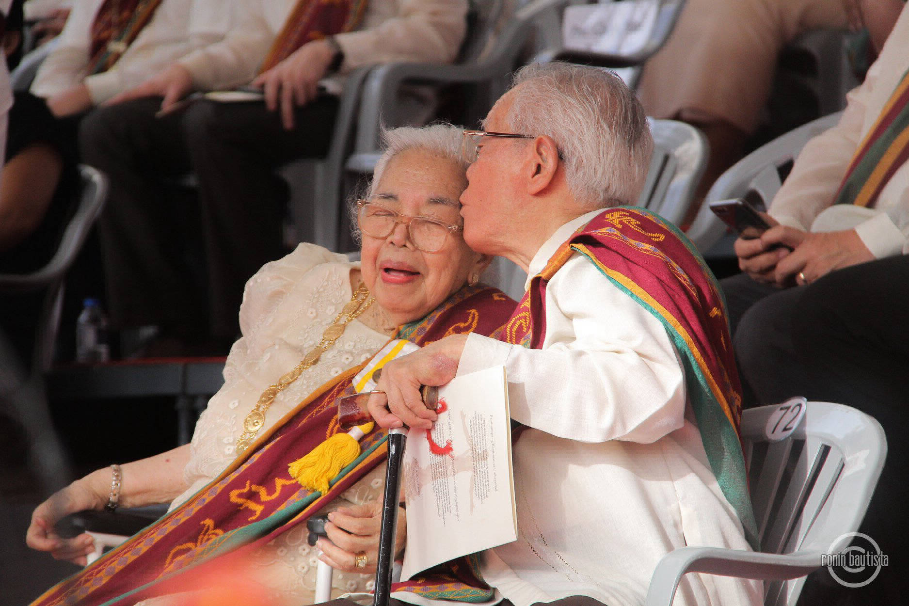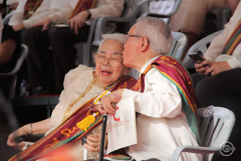 National Artist for Theater Amelia Lapeña-Bonifacio gets a kiss from her husband after delivering the morning's commencement address at the University of the Philippines Diliman. June 2018